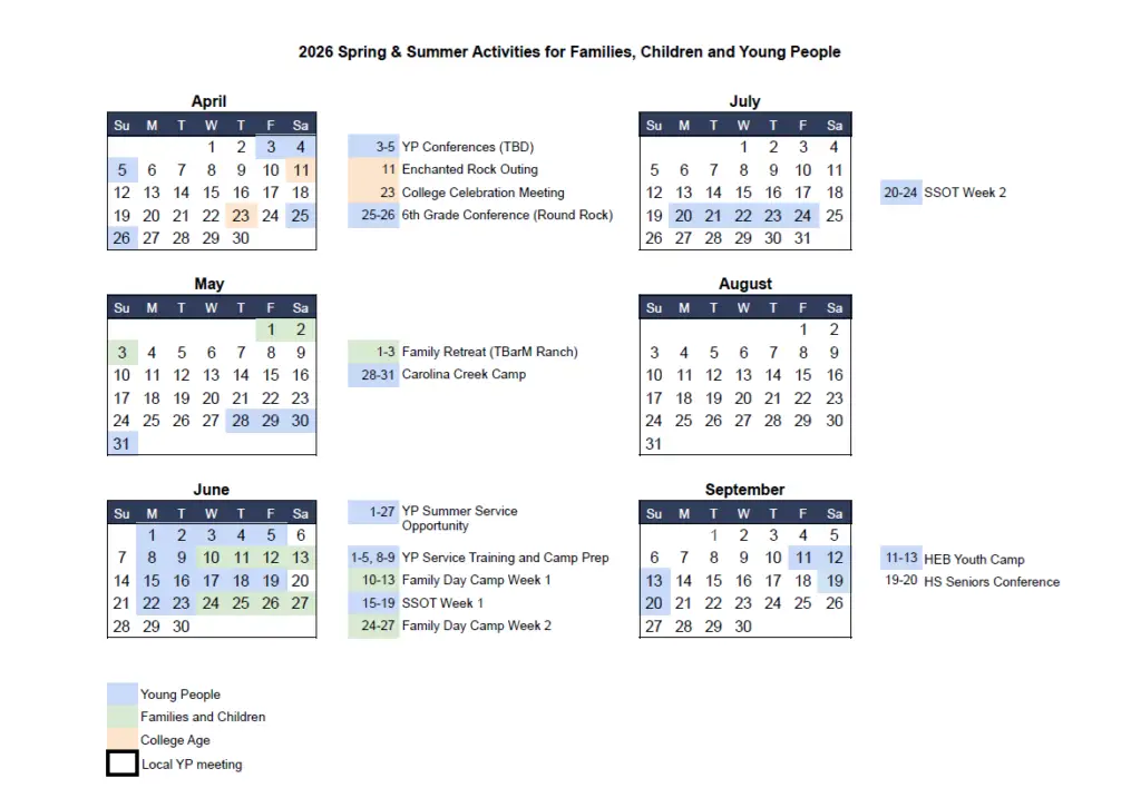 The 2025 Summer Service Opportunity (SSO) will take place during the month of June and is for middle school and high school age young people (going into the 7th-12th grade). Their service will primarily be related to working as camp leaders during the upcoming Family Day Camps, and practical services to prepare for the camps. The SSO will start with three days of training (June 2-4) and the service opportunities will continue throughout the month of June